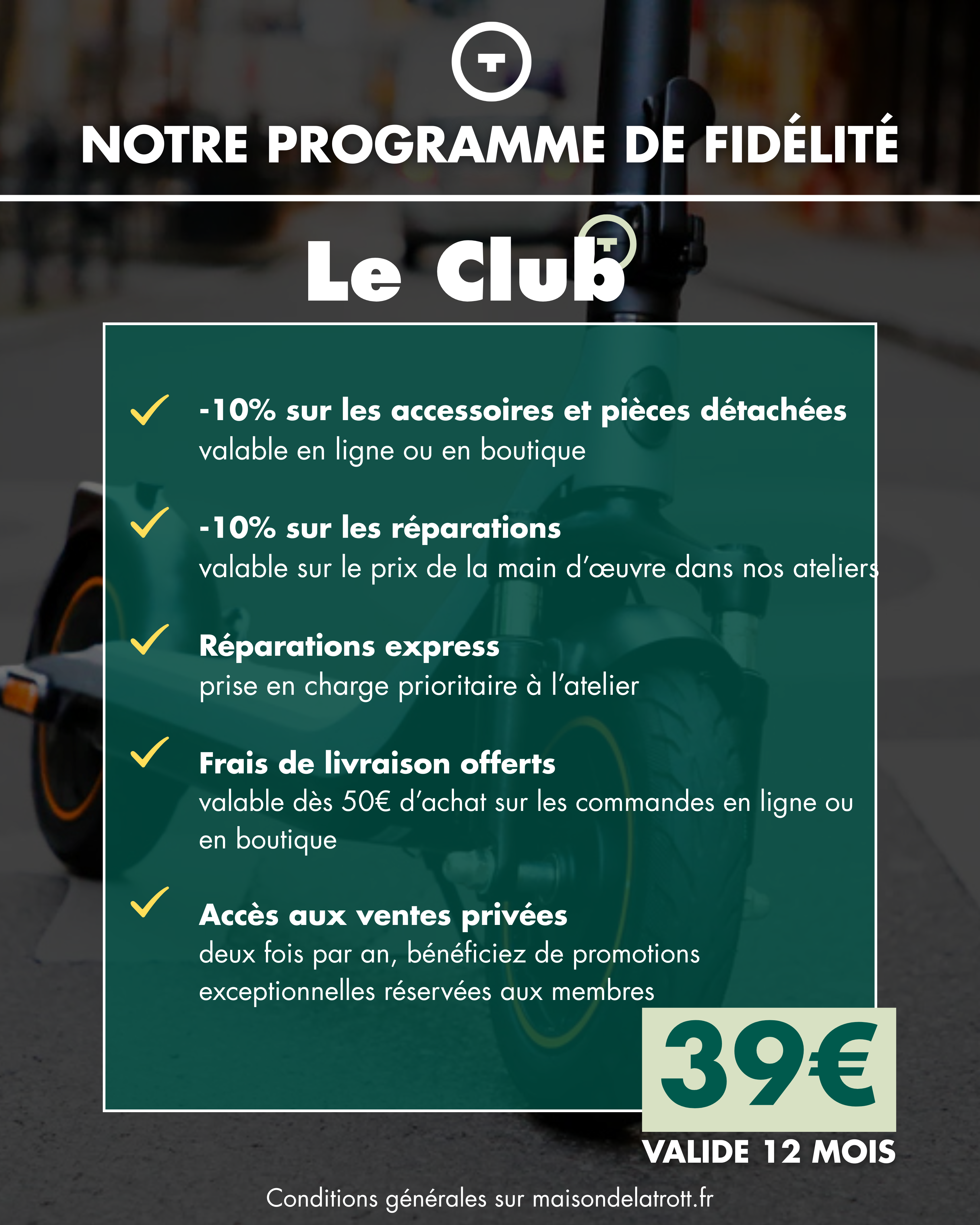 En ce moment, l'adhésion au CLUB est OFFERTE pour tout achat d'une trottinette neuve (valable jusqu'au 31/12/2025).